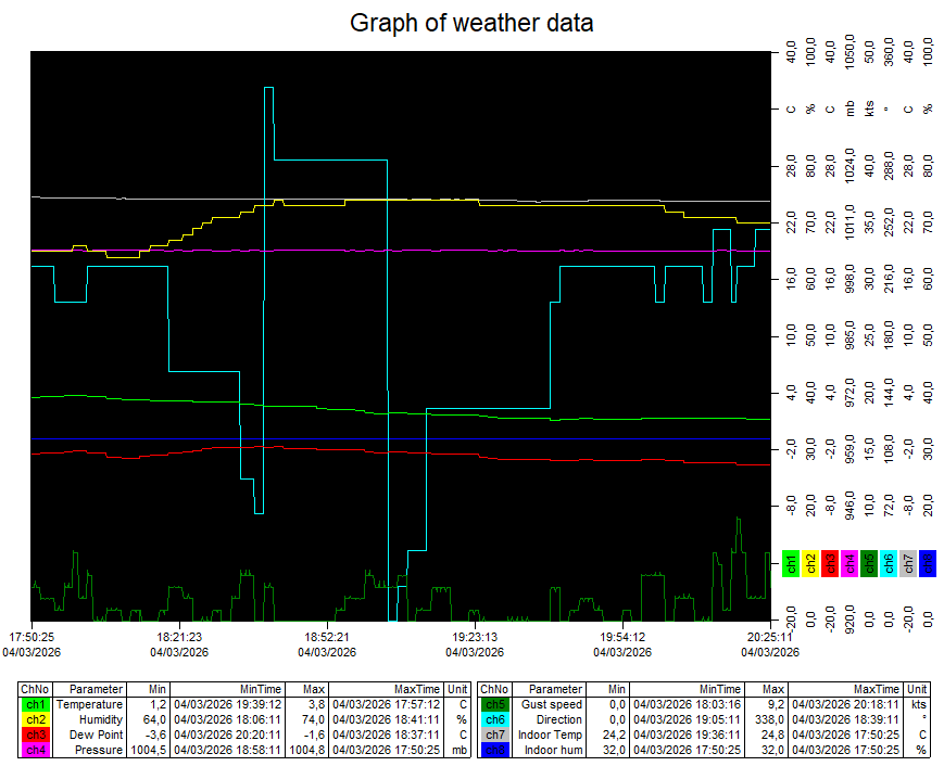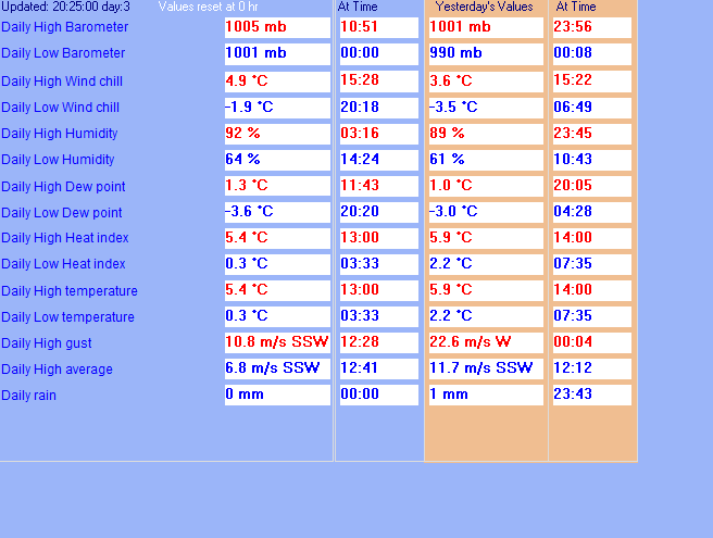 | Maximum Temperature (since midnight) | 5.4°C at: 13:00 | Minimum Temperature (since midnight) | 0.3°C at: 03:33 |