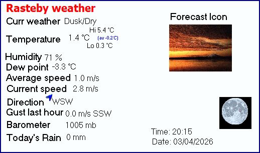 | Humidity | 73 %, Humidex 0.2°C | Barometer corrected to msl | 1005 mb |